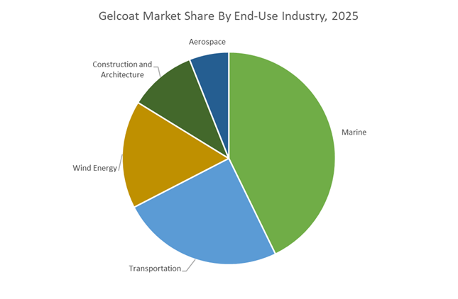 The marine sector accounted for 42.8% of gelcoat consumption in 2025, making it the dominant end-use industry. Gelcoats serve as the outer protective layer for fiberglass boat hulls, yachts, and personal watercraft, providing UV protection, water resistance, corrosion protection, and high-gloss finishes. Growth in electric watercraft, luxury yachts, and aftermarket boat repair is strengthening long-term demand for durable gelcoat systems.