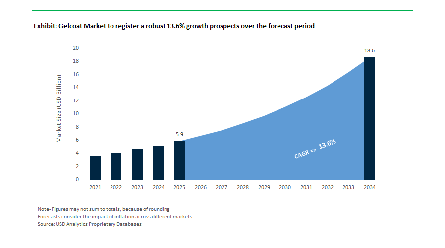 The Gelcoat Market is projected to expand from $5.9 billion in 2025 to $18.6 billion by 2034, registering a strong CAGR of 13.6% during the forecast period. Growth is anchored in accelerating demand for high-performance surface coatings used in fiber-reinforced composites across marine vessels, wind turbine blades, rail interiors, construction panels, automotive SMC components, and industrial equipment. Increasing infrastructure modernization, renewable energy capacity additions, and lightweight mobility solutions are driving consumption of advanced polyester and vinyl ester gelcoats engineered for UV resistance, corrosion protection, fire retardancy, and improved surface aesthetics.