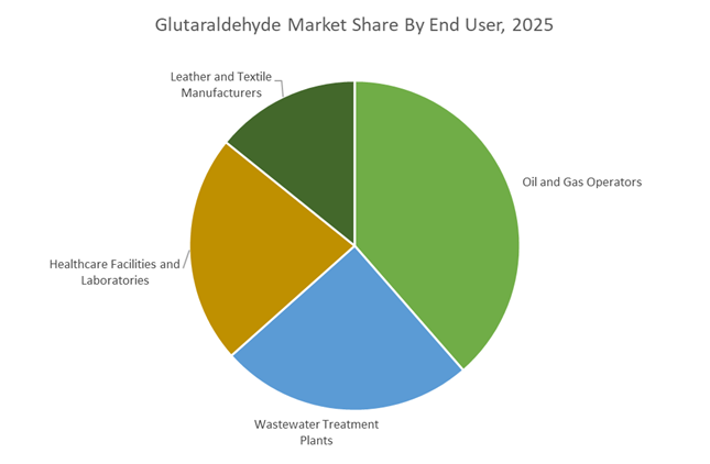 Oil and Gas Operators represented 38.60% of the Glutaraldehyde Market share in 2025, making this sector the largest end-user of glutaraldehyde-based antimicrobial treatments. The oil and gas industry relies on glutaraldehyde as a critical biocide used in waterflood systems, hydraulic fracturing fluids, and produced water treatment operations. Microbial contamination in these systems can lead to biofilm formation, reservoir souring, and corrosion of pipelines and processing equipment, creating operational risks and increased maintenance costs. Continuous injection of glutaraldehyde into production and water handling systems helps maintain microbial control and ensures stable hydrocarbon production. In 2025, demand from the energy sector is influenced by the ongoing productivity optimization of unconventional shale reservoirs. Operators are increasingly implementing refracturing programs and enhanced oil recovery techniques in mature shale basins to extend well life and improve production efficiency. These operations require effective water treatment and microbial control strategies, sustaining strong consumption of glutaraldehyde biocides across oilfield production systems.