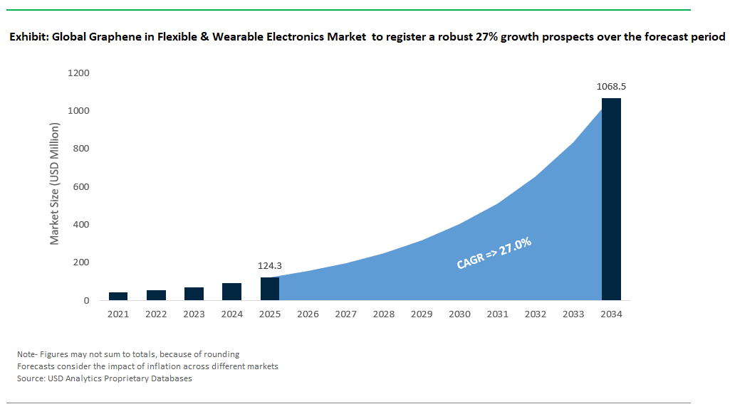 The global market for graphene in flexible and wearable electronics is forecast to surge from USD 124.3 million in 2025 to USD 1,068.3 million by 2034, growing at a CAGR of 27%. This expansion is fueled by rapid adoption in consumer electronics, healthcare wearables, and energy-harvesting devices.