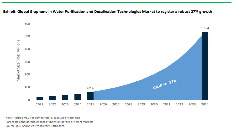The graphene in water purification and desalination market is poised for significant growth between 2025 and 2034, driven by escalating global demand for clean water solutions and the urgent need to reduce energy consumption in water treatment processes. Market analysts project robust expansion at a CAGR of 27%, with total market value expected to exceed USD 536.3 million by 2034 from USD 62.4 million in 2025, as industries, governments, and utilities turn to graphene-based technologies to overcome the limitations of traditional reverse osmosis (RO) and polymer membrane systems.