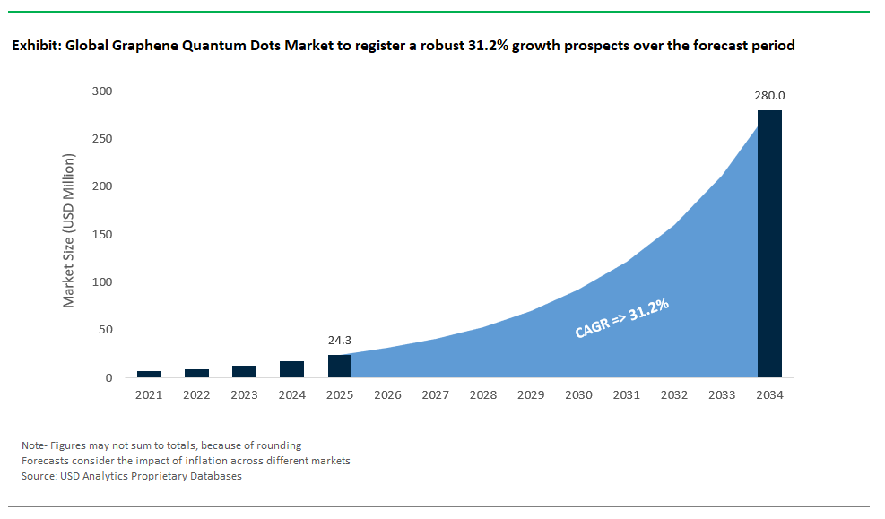 The graphene quantum dots (GQDs) market is poised for remarkable growth between 2025 and 2034, driven by rising demand across biomedicine, energy, electronics, and advanced computing sectors seeking innovative nanoscale solutions. Analysts forecast the market to expand at a robust CAGR of 31.2%, with total market value projected to reach USD 279.9 million by 2034 from USD 24.3 million in 2025, as industries exploit the unique optical, electronic, and biocompatible properties of GQDs to enable next-generation technologies.