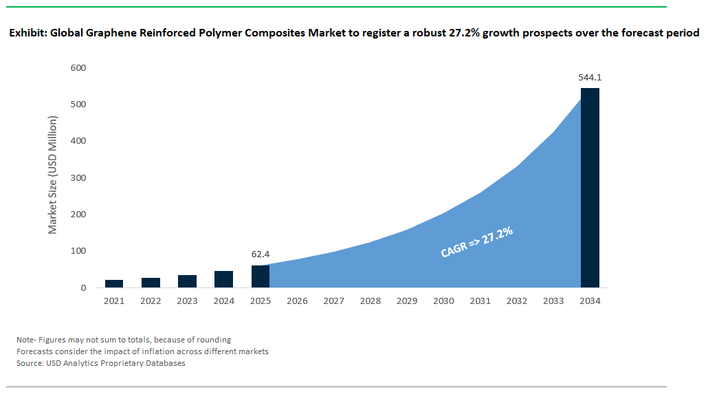 The graphene reinforced polymer composites market is entering a dynamic growth phase between 2025 and 2034, fueled by surging demand across aerospace, automotive, renewable energy, medical devices, and advanced manufacturing sectors seeking lighter, stronger, and multifunctional materials. Analysts forecast the market to grow at a compelling CAGR of 27.2%, potentially surpassing USD 544 million by 2034 from USD 62.4 million in 2025, as industries leverage graphene’s transformative properties to achieve performance levels unattainable with conventional composites.