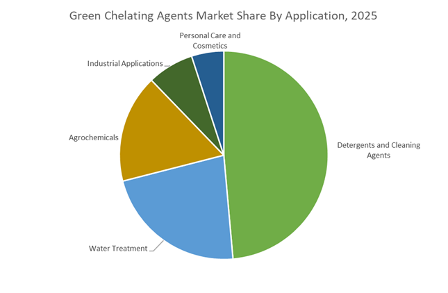Detergents and Cleaning Agents represented 48.60% of the Green Chelating Agents Market share in 2025, making this sector the primary demand center for environmentally friendly chelating systems. Chelating agents are essential components of cleaning formulations because they bind calcium, magnesium, and other metal ions present in hard water, preventing these ions from interfering with surfactant activity and improving cleaning efficiency. The shift toward green chelating agents has accelerated as governments and environmental agencies increasingly regulate the use of phosphate builders and non-biodegradable chelants in household and industrial detergents. In response, detergent manufacturers have adopted biodegradable chelant systems derived from organic acids and other renewable feedstocks, allowing them to meet regulatory requirements while maintaining product performance. In 2025, the expansion of phosphate bans across multiple global regions, including North America, Europe, and emerging markets in Latin America and Asia, is significantly influencing detergent formulation strategies. Multinational consumer goods companies increasingly prefer standardized global detergent formulations incorporating green chelating systems, creating economies of scale that reduce ingredient costs and accelerate adoption across both regulated and non-regulated markets.