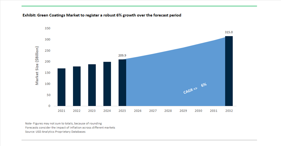 The global Green Coatings Market was valued at USD 209.9 billion in 2025 and is projected to grow at a CAGR of 6% between 2025 and 2032, reaching USD 315.6 billion by 2032. This large and rapidly expanding market is being reshaped by the convergence of regulatory pressure, sustainability mandates, and technological innovation across architectural, automotive, industrial, and marine sectors.