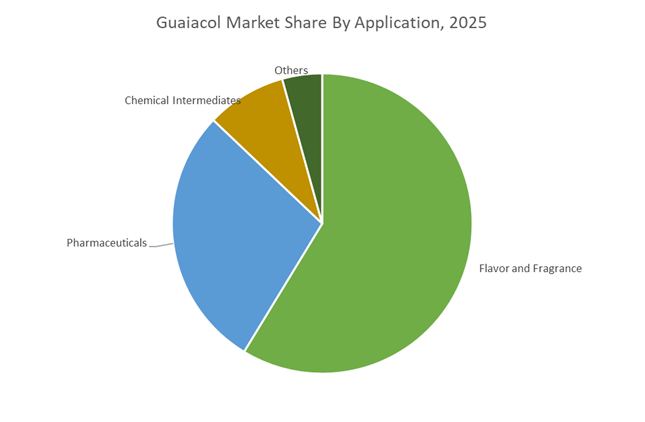 Flavor and Fragrance represented 58.70% of the Guaiacol Market share in 2025, making it the largest application segment for guaiacol-based chemical intermediates. The compound serves as a foundational raw material in the production of synthetic vanillin and ethyl vanillin, which are extensively used in food flavoring, confectionery products, baked goods, dairy desserts, beverages, perfumes, and cosmetic fragrances. In addition to vanillin synthesis, guaiacol is also used in the production of other aromatic compounds such as guaiacyl acetate and eugenol derivatives, which are incorporated into flavor formulations and fragrance compositions. The scale of global food processing and consumer product manufacturing ensures steady demand for guaiacol-based flavor ingredients. In 2025, the guaiacol market continues to benefit from consistent growth in global vanillin consumption, which is expanding at an estimated 4–5% annual growth rate driven by rising demand for flavored foods and beverages. Increasing emphasis on clean label formulations and natural flavor positioning has further strengthened demand for high-quality guaiacol-based vanillin, particularly as manufacturers shift away from lignin-derived vanillin toward higher purity guaiacol synthesis routes.