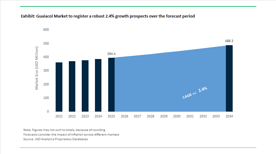The Guaiacol Market is projected to grow from $394.4 Million in 2025 to $488.2 Million by 2034, registering a CAGR of 2.4%. Growth remains moderate compared to other specialty aromatics due to structural shifts toward lignin-derived bio-vanillin; however, sustained demand from pharmaceuticals, agrochemical intermediates, veterinary formulations, and flavor synthesis continues to underpin volume stability. Market dynamics are increasingly influenced by purity regulations, captive catechol integration strategies, and the repositioning of aroma performance businesses toward higher-value specialty segments.