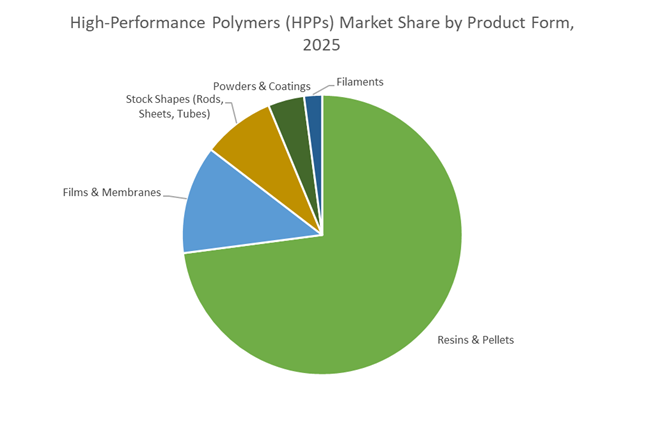 Resins and pellets command around 70% of the High-Performance Polymers market because they sit at the most economically powerful point in the value chain: processing control and design repeatability. OEMs increasingly prefer pre-compounded HPP pellets over raw polymers because performance differentiation now happens at the formulation stage, not at the molding press. The ability to deliver 40–50% weight reduction versus aluminum or steel has moved from a materials advantage to a system-level enabler—particularly in automotive, aerospace, and electronics, where every gram removed cascades into downstream savings in cooling, fastening, and structural reinforcement. The market has also crossed a thermal credibility threshold: continuous service capability at 260°C places PEEK and advanced PPA resins squarely in applications once reserved for titanium or stainless steel, such as turbocharger housings, valve seats, and high-pressure fluid connectors. Critically, 2025-grade resins are functional thermal materials, with next-generation grades offering 2× higher thermal conductivity, allowing designers to consolidate metal heat spreaders into single molded parts. This convergence of lightweighting, thermal management, and chemical durability—validated by >90% strength retention after prolonged coolant exposure—explains why pellets and resins dominate market share: they reduce qualification risk, shorten design cycles, and give OEMs predictable performance at scale.