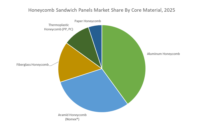Aluminum honeycomb maintains the highest 40% share in the Honeycomb Sandwich Panels Market due to its unmatched balance of structural performance, low density, and multifunctional physical properties that are indispensable across aerospace, transportation, marine, and industrial applications. The inherent geometry of the hexagonal honeycomb structure allows aluminum cores to behave like a network of miniature I-beams, resulting in extraordinarily high specific stiffness and strength-to-weight ratios that far exceed those of polymeric or paper-based cores. This performance advantage enables panels to endure substantial compressive and shear loads while keeping weight to an absolute minimum—an essential requirement in sectors where mass reduction drives energy efficiency and payload optimization. Aluminum honeycomb’s dominance is further reinforced by its non-combustibility and corrosion resistance, with alloys such as 5052 and 5056 meeting stringent fire regulations, including certain A2 classifications in European building standards. Its superior thermal and electrical conductivity, which polymeric cores cannot replicate, makes it indispensable for applications where heat spreading, thermal management, or EMI mitigation is required—such as satellite structures, avionics enclosures, electronic heat sinks, and high-performance industrial equipment. These combined attributes—mechanical reliability, fire resistance, heat dissipation capability, and broad design flexibility—solidify aluminum honeycomb as the most widely adopted and strategically essential core material in the global honeycomb sandwich panel ecosystem.