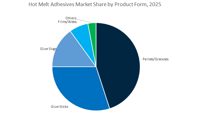 The pellets and granules form dominates the global hot melt adhesives market, capturing an estimated 44.1% share in 2025, largely due to its widespread adoption in industrial-scale packaging, woodworking, and product assembly applications. These solid, free-flowing forms enable automated feeding, metered melting, and consistent dispensing, making them ideal for high-speed production environments. Pellets and granules provide superior shelf stability, easy handling, and minimal waste, allowing manufacturers to streamline inventory management and operational throughput. In addition, pelletized HMAs are compatible with bulk melt units, extrusion systems, and robotic applicators, aligning with the industry’s increasing shift toward automation and smart manufacturing. As companies pursue eco-efficient and bio-based feedstocks, pellets have also become the preferred delivery form for renewable polyolefin and EVA formulations, supporting sustainability initiatives without compromising adhesive performance.