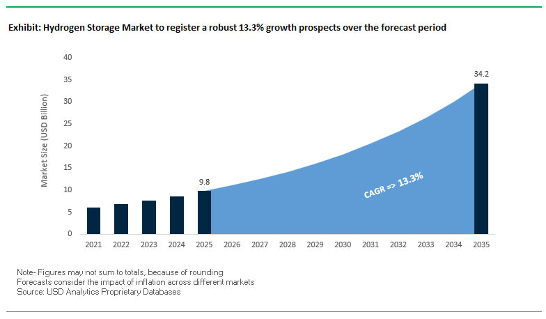 This USDAnalytics study on the global Hydrogen Storage Market provides a rigorous, end-to-end assessment of how policy-driven decarbonization, fuel cell mobility, large-scale electrolysis, and green industrial feedstock are reshaping storage technologies and business models; this report investigates the performance, cost, and safety trajectories of compressed gas, liquid hydrogen, underground caverns, and material-based storage solutions, tracks technology breakthroughs in Type IV composite tanks, cryogenic systems, solid-state materials, LOHCs, and MOF-based adsorbents, and delivers analysis reviews on how these advances translate into real-world deployment across transportation, grid-scale storage, industrial feedstock, and logistics value chains. It highlights the impact of salt cavern megaprojects, heavy-duty mobility pilots, and green steel initiatives on storage system sizing, purity requirements, and infrastructure standardization, while also benchmarking leading vendors on project pipelines, partnership strategies, and innovation roadmaps. By combining quantitative market modeling with qualitative insights on regulations, safety codes, and hydrogen backbone planning, this report is an essential resource for OEMs, storage technology suppliers, gas utilities, EPC contractors, investors, and policymakers seeking to position themselves competitively in the fast-evolving hydrogen storage ecosystem.