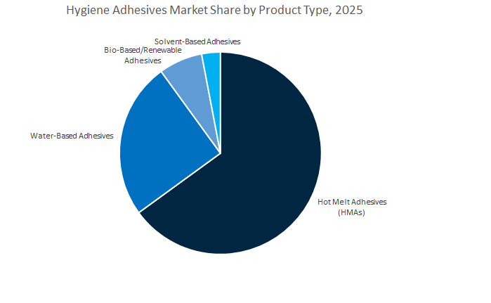 The hot melt adhesives (HMAs) segment dominates the global hygiene adhesives market, accounting for a projected 63.5% share in 2025, firmly establishing its role as the adhesive backbone of diaper, feminine hygiene, and adult incontinence product manufacturing. HMAs are prized for their fast setting time, strong bonding capability, and compatibility with non-woven, film, and elastic substrates, enabling seamless integration into high-speed, automated production lines that can operate at over 1,000 units per minute. These thermoplastic adhesives ensure reliable lamination of topsheets, cores, and backsheets, providing both product integrity and wearer comfort. Their excellent thermal stability, low odor, and controlled open time make them ideal for continuous operations with minimal maintenance downtime. Key innovations in polyolefin- and metallocene-based hot melt systems have improved oxidative stability, tack retention, and substrate versatility, aligning with manufacturers’ efficiency and sustainability goals. Moreover, the rise of bio-compatible and skin-friendly formulations has expanded HMAs’ use in premium hygiene products targeting sensitive consumers and infants.