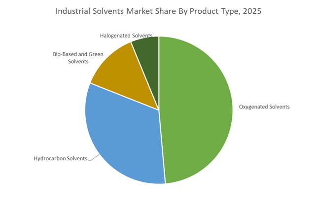 Oxygenated solvents accounted for 48.6% of the Industrial Solvents Market share in 2025, making them the dominant solvent category across multiple industrial chemical applications. Oxygenated solvents including alcohols, ketones, esters, and glycol ethers provide strong solvency, controlled volatility, and compatibility with modern environmental regulations, enabling their widespread use in coatings formulations, pharmaceutical processing, adhesives manufacturing, and industrial cleaning applications. Compared with hydrocarbon and halogenated solvents, oxygenated solvents offer lower toxicity profiles, improved biodegradability, and reduced environmental impact, making them attractive to manufacturers facing stricter chemical safety standards. In 2025, regulatory pressure on volatile organic compound (VOC) emissions continues to reshape solvent demand patterns globally. To address evolving regulations, producers have developed low-VOC and regulatory-exempt oxygenated solvent formulations that allow manufacturers to maintain high solvency performance while meeting regional air quality requirements. These innovations have accelerated the substitution of traditional hydrocarbon and halogenated solvents in several industrial formulations.