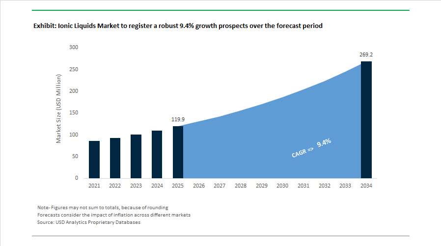The Ionic Liquids Market is expected to grow from $119.9 million in 2025 to $269.1 million by 2034, registering a CAGR of 9.4%. Growth is driven by increasing adoption of ionic liquid electrolytes in advanced batteries, expansion of green solvent systems in chemical manufacturing, and rising deployment in carbon capture technologies.