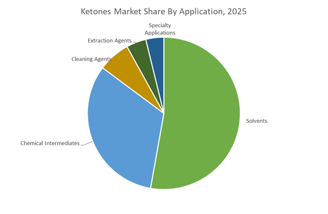 Solvent applications represented 52.8% of total demand in 2025, driven by ketones such as acetone, MEK, and MIBK used in paints, coatings, adhesives, and printing inks. Their strong solvency for acrylic, epoxy, and vinyl resins combined with controlled evaporation rates supports high-performance industrial coating and manufacturing processes.