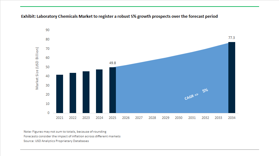 The Laboratory Chemicals Market is projected to grow from $49.8 billion in 2025 to $77.3 billion by 2034, expanding at a CAGR of 5%. Market momentum is being driven by next-generation biologics research, semiconductor materials testing, climate-neutral manufacturing mandates, and increasing automation in research laboratories. Demand is particularly strong for high-purity reagents, chromatography media, analytical standards, molecular biology chemicals, and downstream purification solutions supporting antibody and cell therapy production.