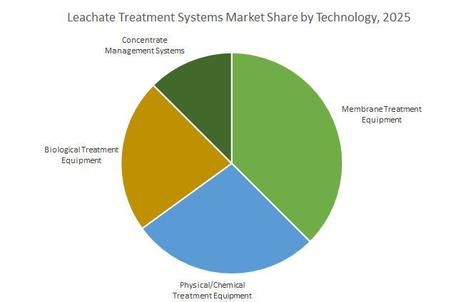 Membrane Treatment Equipment (38%) dominates the market due to its superior performance in removing salts, heavy metals, and persistent organic pollutants. Physical/Chemical Treatment Equipment (26.9%) remains essential as a pre-treatment step to protect downstream systems and enhance overall efficiency. Biological Treatment Equipment (24.6%) is widely used for young leachate with high BOD but is less effective for mature landfill streams. Concentrate Management Systems (11.8%) address the energy-intensive handling of toxic brine from RO systems, highlighting the cost challenges associated with high-purity water production. The market’s technology mix underscores the balance between regulatory compliance, operational efficiency, and long-term sustainability.