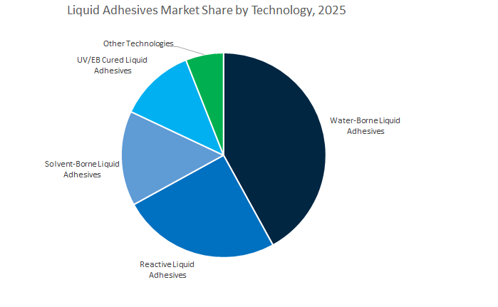 Reactive liquid adhesives represent the market’s high-performance frontier, showing strong growth due to increasing demand for structural bonding and durability in automotive, wind energy, and construction sectors. These adhesives form crosslinked polymer networks upon curing, offering superior mechanical strength, chemical resistance, and long-term stability. Their role in EV battery assembly, composite structures, and advanced glazing underscores their contribution to lightweighting and sustainability in modern manufacturing. Solvent-borne liquid adhesives, though declining, remain vital for specific industrial and footwear applications that require deep substrate penetration, fast setting, and high bond integrity. Meanwhile, UV/EB-cured adhesives are emerging as a high-growth segment in electronics, optics, and medical devices, where precision, transparency, and rapid curing are paramount.