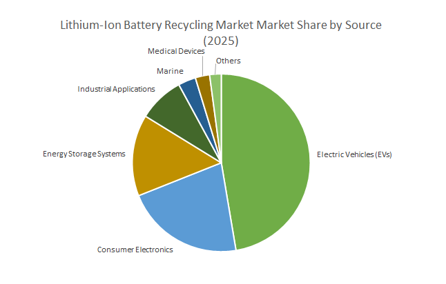 Electric vehicles (EVs) are the largest source segment, accounting for 48% of the lithium-ion battery recycling market in 2025. This dominance is driven by the accelerating retirement of EV batteries as global adoption increases, particularly in China, the United States, and Europe.