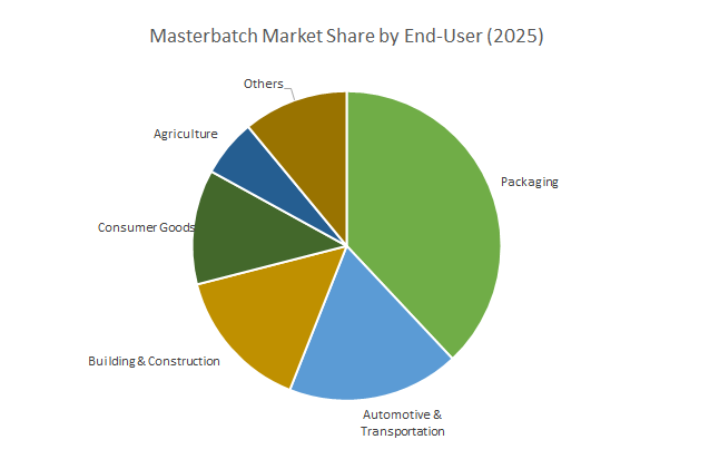 The major end-user is packaging, claiming 38% of the market. Growth is driven by the rapid expansion in flexible and rigid food, beverage, personal care and industrial packaging applications which require accurate color and additive masterbatches for branding, shelf life and product integrity. Automotive & transportation is second biggest masterbatches user accounting to 18% share for lightweighting, UV protection, and aesthetics on dashboards, bumpers, and trims. Building & construction, consumer goods and agriculture are also high potential sectors which use the various types of masterbatch for various applications like pipes, profiles, toys, furniture, irrigation films etc. High-value, fast-growing niche applications including healthcare, textiles and electrical/electronics for specialty and high-purity masterbatches for medical devices, conductive polymers and advanced fibres, confirm the continued expansion of end-use markets for masterbatch solutions.