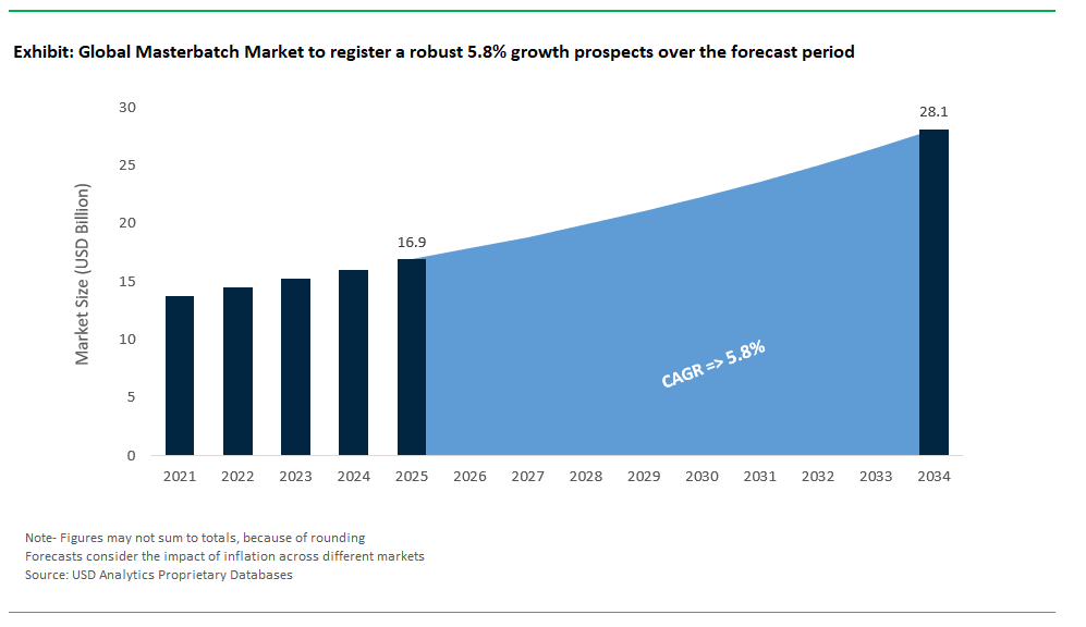 The masterbatch market is projected to grow from $16.9 billion in 2025 to $28.1 billion by 2034, delivering a strong CAGR of 5.8%. This expansion is driven by surging demand for colorants, additives, and functional masterbatches across packaging, automotive, electronics, and consumer goods. Increasing use of plastics, product customization, and stricter performance standards further accelerate market growth.