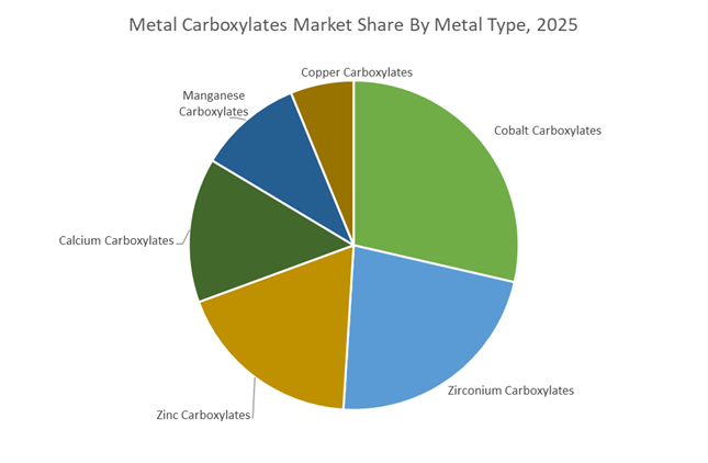 Cobalt carboxylates accounted for 28.60% of the Metal Carboxylates Market share in 2025, making them the most widely used metal-based drier catalysts in coating and resin formulations. These compounds function as oxidative drying catalysts in alkyd paints, varnishes, and printing inks, accelerating the polymerization process that converts liquid coatings into durable solid films. Cobalt carboxylates are particularly valued for their high catalytic efficiency, rapid surface drying capability, and compatibility with alkyd resin systems, enabling coatings to achieve faster drying times and improved film formation. Their effectiveness allows formulators to maintain strong coating performance with relatively low additive concentrations, which contributes to their continued dominance in industrial coating formulations. In 2025, increasing regulatory attention toward cobalt compounds under REACH and other chemical safety frameworks has encouraged coatings manufacturers to explore alternative metal drier systems. However, cobalt carboxylates continue to lead the market due to their superior drying performance and long-established formulation familiarity, with substitution efforts gradually progressing in applications where performance requirements allow cobalt-free alternatives.