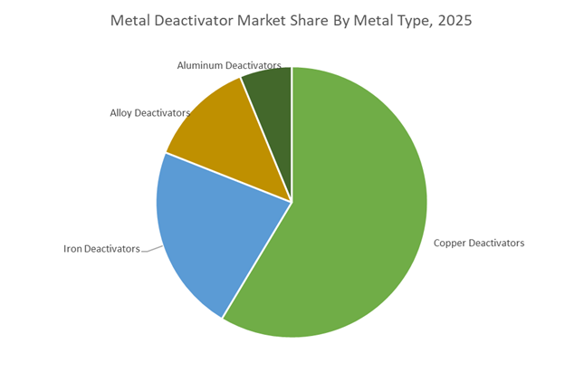 Fuel additives accounted for 42.8% of the Metal Deactivator Market share in 2025, making fuel stabilization the largest application for these chemical additives. Metal deactivators are essential components in gasoline, diesel, jet fuel, marine fuels, and emerging biofuel blends, where they protect fuel quality by preventing metal-catalyzed oxidation reactions during storage and operation. Without metal deactivators, fuels exposed to copper or other catalytic metals can develop oxidation products, gum deposits, and insoluble residues that negatively affect engine performance and fuel system reliability. These additives therefore play a critical role in meeting fuel quality standards, storage stability requirements, and engine cleanliness specifications established by global fuel regulations and industry standards. In 2025, the increasing complexity of fuel formulations has further strengthened demand for metal deactivators. Modern fuels often contain oxygenated components, renewable fuels, and advanced additive packages, which can increase susceptibility to oxidation under high-temperature and long-term storage conditions. Fuel formulators therefore rely on metal deactivators to maintain chemical stability, prevent deposit formation, and ensure consistent fuel performance across distribution and storage systems.