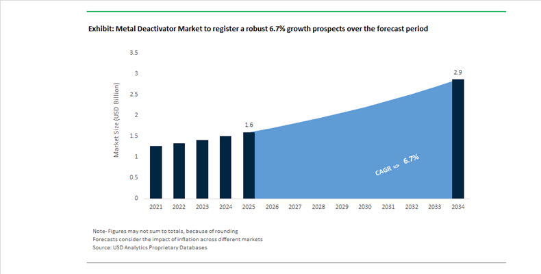 The Metal Deactivator (MDA) Market is projected to expand from $1.6 billion in 2025 to $2.9 billion by 2034, registering a CAGR of 6.7%. Growth is being driven by rising demand for high-performance fuel additives, lubricant stabilizers, hydraulic fluids, EV coolants, and oilfield intermediates that require protection against catalytic oxidation caused by trace metals such as copper, iron, and aluminum. Metal deactivators, typically based on triazole, benzotriazole, and other nitrogen-containing chelating chemistries, play a critical role in improving thermal stability, preventing gum formation, and extending service intervals in high-pressure injection systems and advanced industrial machinery. Increasing electrification, subsea oil production, and stricter fuel quality standards are reshaping the functional requirements for next-generation MDA molecules.