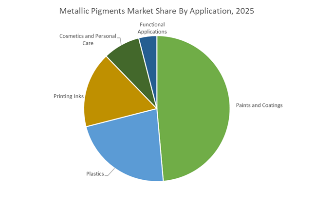 Paints and coatings accounted for 48.60% of the Metallic Pigments Market share in 2025, establishing the sector as the largest consumer of metallic pigment technologies. Metallic pigments are widely used in automotive OEM coatings, refinish paints, industrial coatings, architectural coatings, and protective coatings, where they provide decorative metallic appearance along with improved light reflectivity and visual depth. The automotive industry remains a particularly significant driver of demand, as vehicle manufacturers increasingly utilize metallic and pearlescent coatings to differentiate models and enhance product appeal. In addition to decorative benefits, metallic pigments also contribute to functional performance characteristics such as UV resistance and barrier protection in coating systems. In 2025, the ongoing transition toward waterborne coating technologies has influenced metallic pigment formulation strategies. Pigment producers are developing passivated aluminum pigments and specialized dispersion technologies that maintain pigment stability in aqueous coating systems, preventing hydrogen gas formation and ensuring consistent flake orientation, which is essential for achieving uniform metallic appearance in modern waterborne automotive and industrial coatings.