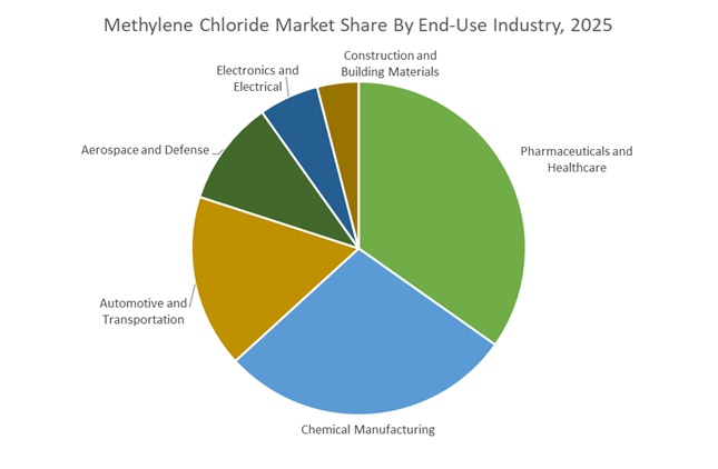 Pharmaceuticals and healthcare accounted for 34.80% of the Methylene Chloride Market share in 2025, making drug manufacturing and pharmaceutical chemical processing the largest end-use sector for this solvent. Methylene chloride plays a critical role in pharmaceutical synthesis, active pharmaceutical ingredient (API) production, extraction processes, and crystallization steps, where its solvency properties enable efficient dissolution of complex organic compounds and facilitate selective purification. The solvent is widely used in reaction media and intermediate purification stages during the production of numerous small-molecule drugs and specialty pharmaceutical ingredients. Pharmaceutical manufacturers rely on methylene chloride because it offers excellent solubility for many organic intermediates, rapid evaporation characteristics, and compatibility with multiple reaction pathways, which makes it difficult to substitute in certain synthesis processes. In 2025, pharmaceutical producers are also increasingly focused on strict residual solvent control and regulatory compliance, following International Council for Harmonisation (ICH) guidelines that specify permissible solvent residue levels in finished drug products. As a result, manufacturers have implemented advanced purification techniques, solvent recovery systems, and analytical testing protocols to ensure residual methylene chloride levels remain within regulatory safety limits during pharmaceutical production.