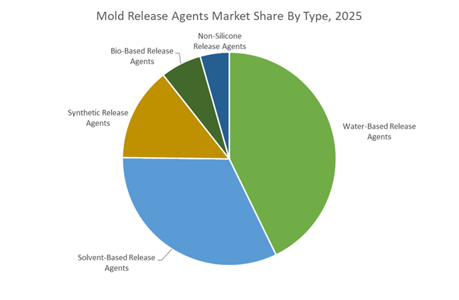 Water-based release agents dominate with a 42.80% market share due to low VOC emissions and regulatory compliance advantages. Semi-permanent and internal release technologies are gaining traction for improving cycle efficiency, reducing mold fouling, and supporting high-volume automated composite and die-casting processes.
