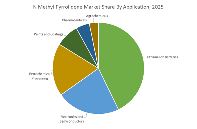 Lithium-ion batteries lead with 42.80% market share, where NMP is essential for dissolving PVDF binders in electrode production. Electronics and semiconductors also represent high-growth segments, requiring ultra-high-purity NMP for wafer cleaning and photoresist stripping. Demand is increasingly concentrated in controlled industrial environments.
