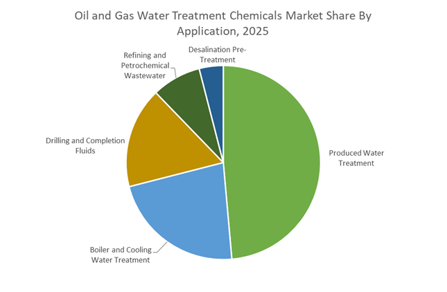 Produced water treatment held 48.60% of the Oil and Gas Water Treatment Chemicals Market by application in 2025, representing the largest consumption segment across upstream and midstream operations. Oil and gas wells typically generate three to seven barrels of produced water per barrel of oil, making water handling and treatment a fundamental operational requirement. Chemical programs including demulsifiers, biocides, corrosion inhibitors, and flocculants are widely used to enable safe disposal or reuse. The accelerating shift toward produced water recycling for hydraulic fracturing and enhanced recovery is increasing demand for high-performance chemical treatment systems capable of managing high-TDS water streams while preventing scaling, microbial contamination, and corrosion in closed-loop reuse infrastructure.