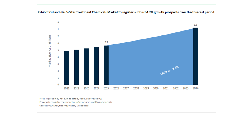 The Oil and Gas Water Treatment Chemicals Market is valued at $5.7 billion in 2025 and is projected to reach $8.3 billion by 2034, growing at a CAGR of 4.2%. Growth is driven by rising produced water volumes and stricter discharge regulations. Increasing adoption of water reuse strategies in shale basins is sustaining long-term demand.