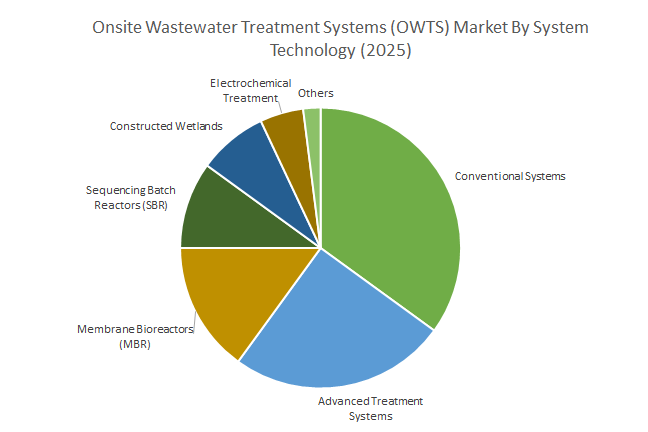 Residential and small business systems, with treatment capacities of 1,000–5,000 L/day, represent the core of the OWTS market at 42.1% share. These systems effectively serve single-family homes, small apartment complexes, and small commercial establishments like cafes and offices. Micro-scale systems (<1,000 L/day) primarily support single homes and micro-businesses, relying on conventional or compact advanced units. Larger capacities (5,000–20,000 L/day) cater to hotels, schools, clinics, and clustered residential developments, while industrial and large institutional OWTS (>20,000 L/day) are specialized solutions for resorts, campuses, and industrial facilities not connected to central sewers.