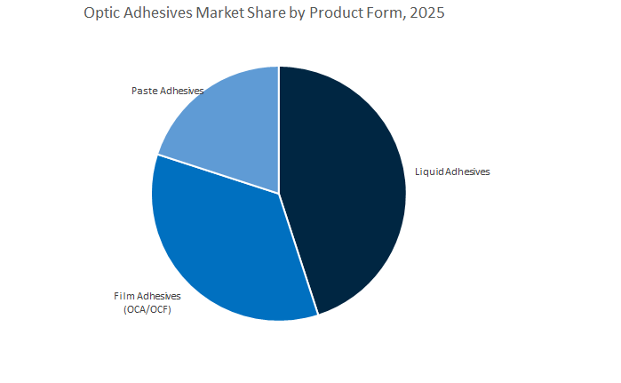The liquid adhesives segment holds the dominant position in the global optic adhesives market, projected to capture 46.2% of the market share by 2025. Liquid optic adhesives are widely favored due to their versatility, ease of application, and ability to conform to complex geometries, making them indispensable in optical bonding, lens cementing, and electronic display manufacturing. Their high optical clarity, strong adhesion to glass and plastic substrates, and ability to minimize light scattering and reflection losses have cemented their importance in consumer electronics, automotive displays, and precision optical devices. The ongoing expansion of OLED, AR/VR, and head-up display (HUD) technologies is driving manufacturers to invest in advanced UV-curable and two-part liquid formulations that provide low shrinkage, high transparency, and long-term environmental stability.