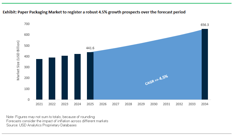 The Paper Packaging Market is projected to grow from $441.6 billion in 2025 to $656.3 billion by 2034, at a CAGR of 4.5%. Growth is primarily driven by e-commerce expansion, regulatory pressure to replace single-use plastics, and increased demand for sustainable, recyclable, and compostable fiber-based packaging solutions across multiple industries.