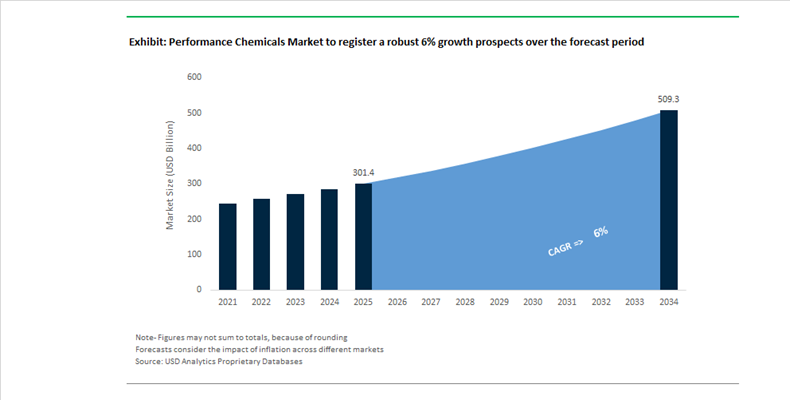 The global performance chemicals market is projected to expand from $301.4 billion in 2025 to $509.2 billion by 2034, registering a steady CAGR of 6%. Growth is anchored in rising demand for high-performance coatings, advanced dispersions, specialty silica, catalysts, and functional additives across automotive, construction, aerospace, electronics, and industrial manufacturing. Unlike commodity chemicals, performance chemicals compete on technical differentiation, lifecycle durability, sustainability compliance, and application-specific customization. From electronic-grade peroxides to aerospace primers and circular silica fillers, the sector is undergoing structural transformation through consolidation, digitalization, and ESG-driven capital reallocation.