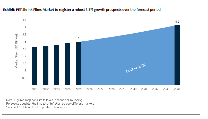 The global PET shrink films market is expected to grow from $3 billion in 2025 to $4.2 billion by 2034, at a CAGR of 3.7%. Growth is driven by increasing demand in food, beverage, and consumer goods sectors, with a focus on sustainability, high-clarity labeling, and advanced barrier performance.