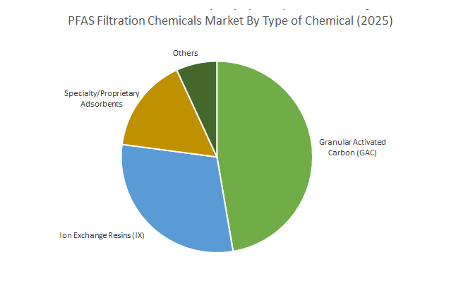 Granular Activated Carbon (GAC) holds the largest share in the PFAS filtration chemicals market, accounting for approximately 47.3% of total market demand in 2025. GAC remains the most widely adopted solution due to its well-documented performance in removing long-chain PFAS compounds, relatively low capital costs, and ease of integration into existing municipal and industrial filtration systems. Its high surface area and regenerability make it ideal for continuous and large-volume water treatment operations. However, the market is rapidly shifting toward more advanced materials, with Specialty/Proprietary Adsorbents growing at the fastest rate of 11.2% CAGR through 2034. These next-generation materials including functionalized silica for short-chain PFAS, engineered biochar composites, and molecularly imprinted polymers (MIPs) offer superior selectivity, adsorption capacity, and regeneration potential, making them ideal for complex remediation scenarios. Ion Exchange Resins (IX) are also witnessing significant growth, particularly in high-throughput systems where selective PFAS removal and lower breakthrough volumes are critical. Other chemical categories, including hybrid filtration blends and emerging sorbents, continue to support niche and experimental PFAS control solutions.
