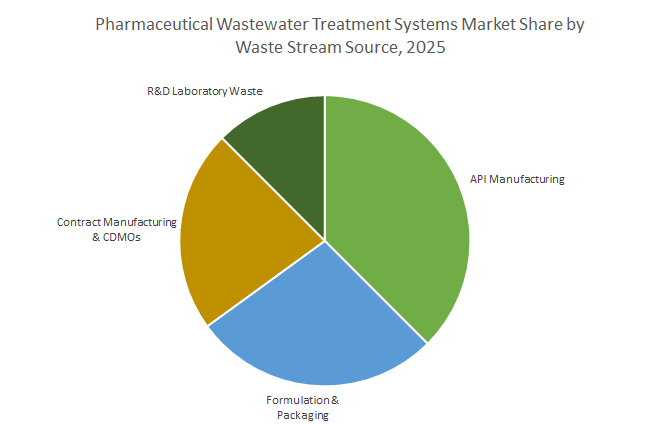 API Manufacturing (38%) generates the most complex, high-strength, and variable wastewater, necessitating sophisticated treatment systems and making it the largest segment. Formulation & Packaging (26.9%) produces lower-strength but high-volume effluents, while Contract Manufacturing & CDMOs represent the fastest-growing segment due to diverse product portfolios and high compliance requirements. R&D Laboratory Waste is niche but critical for risk mitigation, requiring specialized point-source treatment before discharge. The complexity of wastewater directly drives investment and technology adoption across these segments.