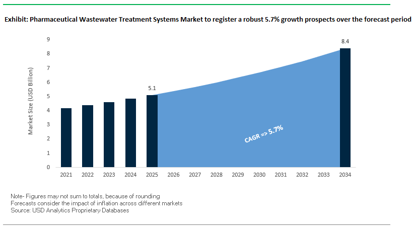 The pharmaceutical wastewater treatment systems market is projected to grow from $5.1 billion in 2025 to $8.4 billion by 2034, registering a healthy CAGR of 5.7%. This growth is underpinned by rising environmental regulations, the need for advanced treatment technologies, and increasing pharmaceutical manufacturing across Asia-Pacific and Europe.
