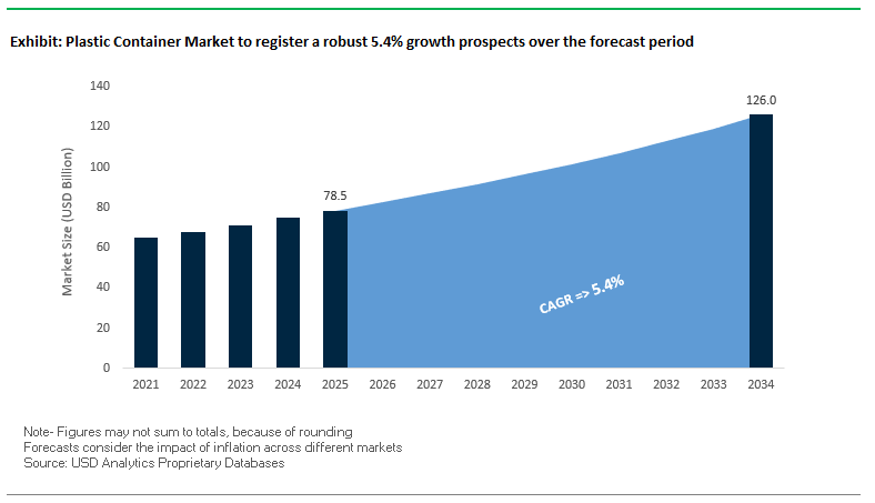 The global plastic container market is projected to grow from $78.5 billion in 2025 to $126 billion by 2034, registering a CAGR of 5.4%. Growth is largely fueled by demand from the food and beverage sector, the continued dominance of PET and HDPE materials, and the industry-wide adoption of lightweighting and recycled content. Manufacturers are increasingly focusing on durable, cost-effective, and environmentally friendly designs to meet consumer and regulatory demands.