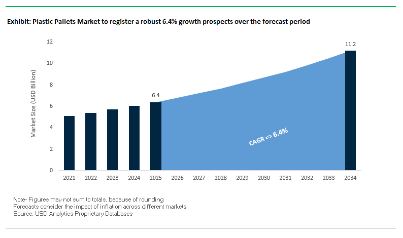 The global plastic pallets market is expected to grow from $6.4 billion in 2025 to $11.2 billion by 2034, at a CAGR of 6.4%. Growth is driven by the adoption of durable, lightweight, and hygienic pallets across food & beverage, pharmaceuticals, cold chain logistics, and industrial sectors, supporting cost savings and international shipping compliance.
