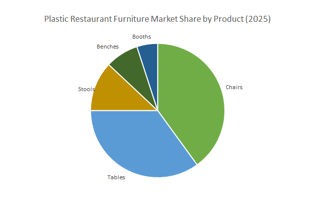 Chairs, with 40% market share, are the biggest category in the plastic restaurant furniture market due to high turn-rate replacements, wide color/finish selection, and stackability for storage. Tables, at 35%, remain standard on wipe-clean, scratch-resistant surfaces and clip-on bases, with expansion directed toward modular/stackable designs that enable fast patio flips and flexible seating plans. Stools are increasing in casual and bar-service areas for footprint efficiency, and benches/booths are a niche but upscale category where operators desire maximum covers per square meter and durable, easy-sanitize surfaces. Throughout SKUs, recycled content (ocean-plastic combinations, PCR PP/HDPE) and antimicrobial offerings are becoming base RFP requirements for multi-unit chains.