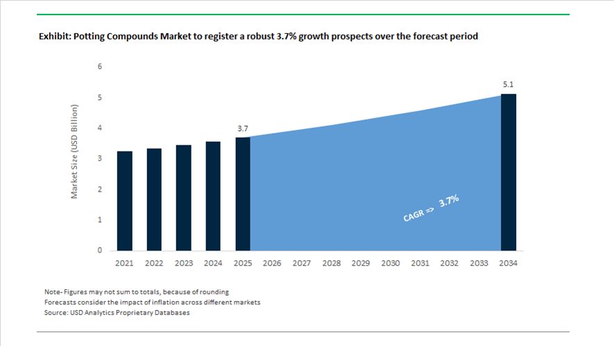 The potting compounds market is valued at $3.7 billion in 2025 and is forecast to reach $5.1 billion by 2034, growing at a CAGR of 3.7%. Growth is driven by electrification, EV power electronics expansion, and renewable energy infrastructure. Increasing miniaturization of electronics is also intensifying demand for advanced encapsulation materials.