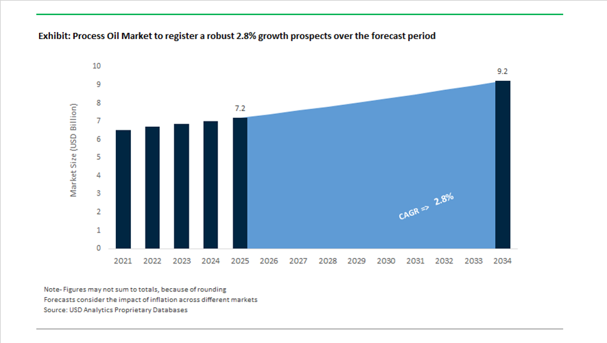 The process oil market is valued at $7.2 billion in 2025 and is projected to reach $9.2 billion by 2034, growing at a CAGR of 2.8%. Growth is stable, supported by tire manufacturing, power transmission, and increasing adoption of sustainable and circular base oils.