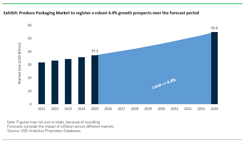 The global produce packaging market is expected to grow from $37.3 billion in 2025 to $55 billion by 2034, at a CAGR of 4.4%. Growth is fueled by rising consumer demand for freshness, convenience, and sustainability, along with regulatory support for eco-friendly materials and food waste reduction initiatives.