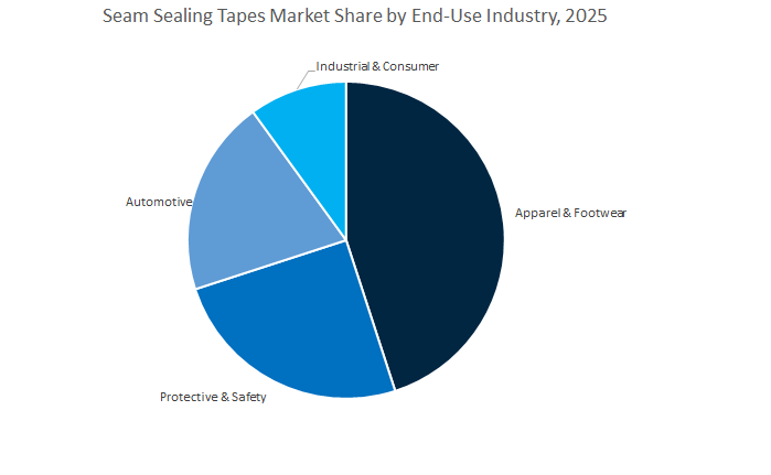 The Protective & Safety segment represents the second-largest and one of the fastest-growing sectors, driven by increasing investments in industrial PPE, firefighting suits, military uniforms, and hazmat gear. Seam sealing in this category ensures chemical, fluid, and pathogen barriers, critical for worker and first-responder safety. Automotive applications are expanding rapidly as manufacturers use seam tapes in convertible roof systems, interior acoustic panels, and water barrier assemblies to improve vehicle sealing efficiency and passenger comfort. The Industrial & Consumer segment, though smaller, showcases steady demand across marine, camping, and outdoor equipment manufacturing, where waterproofing performance remains a key design requirement.