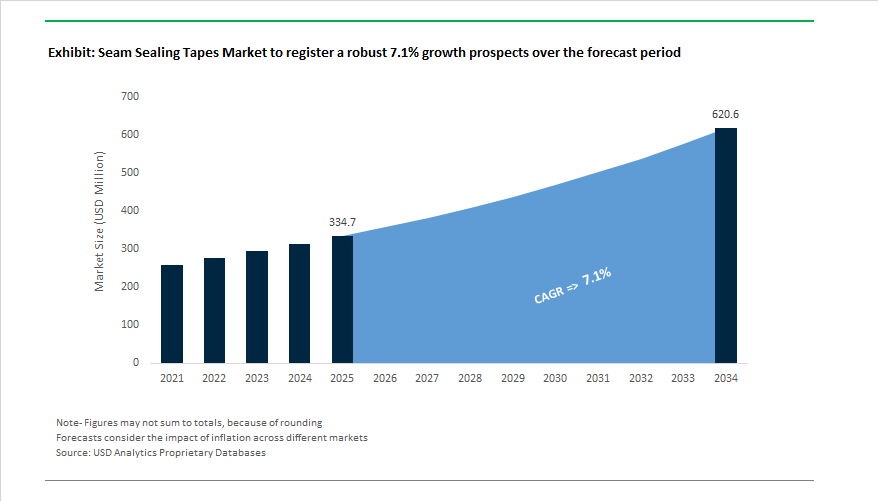 The Global Seam Sealing Tapes Market is projected to grow from $334.7 million in 2025 to $620.5 million by 2034, registering a CAGR of 7.1%. The industry is undergoing a material and technological transformation driven by sustainability mandates, advanced textile engineering, and the shift toward PFAS-free waterproofing technologies. Seam sealing tapes have evolved into high-precision components critical to the integrity, performance, and longevity of waterproof garments, medical protective wear, and industrial fabrics — sectors where moisture ingress control and material flexibility define end-user safety and comfort.